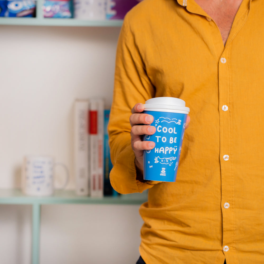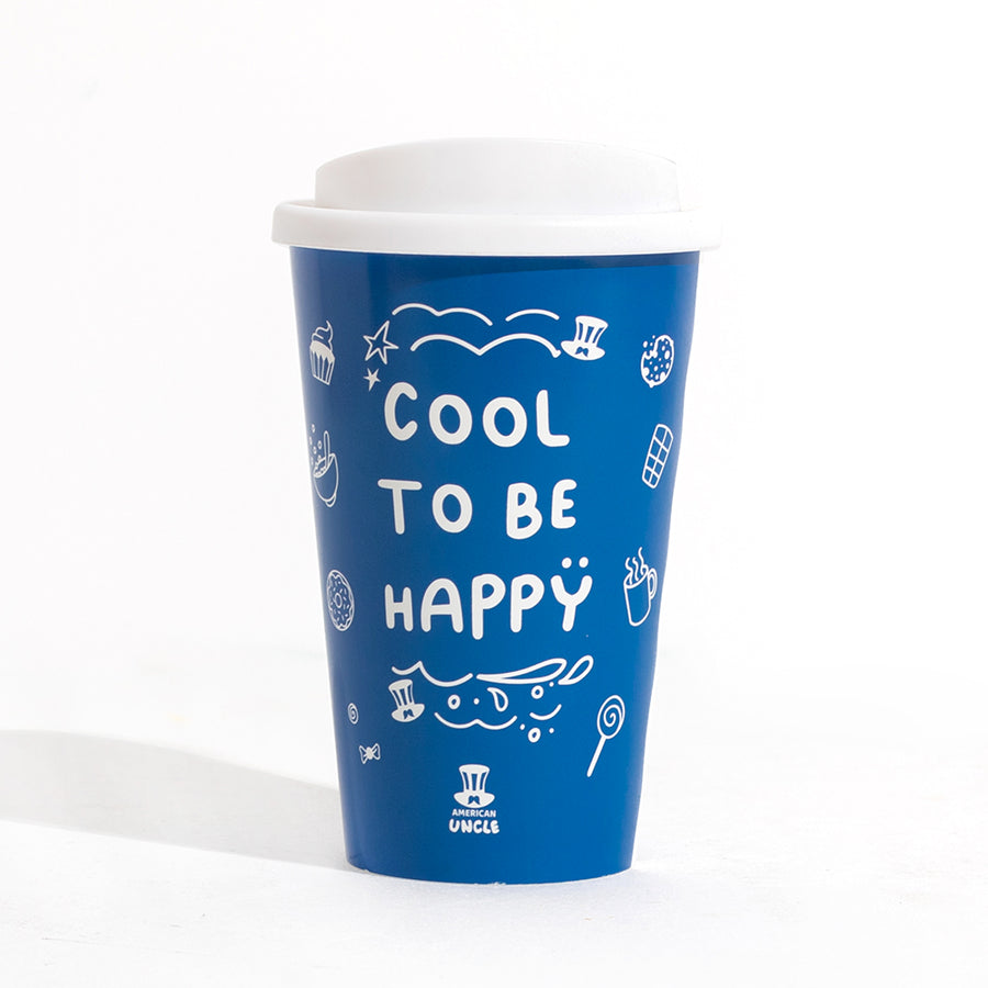 Tasse thermique Cool to be Happy de 350ml, gobelet thermique résistant à double paroi avec couvercle à vis, lavable au lave-vaisselle et adapté au micro-ondes, couleur bleue avec texte Cool to be Happy blanc, dimensions 15,5 x 9,5 cm.