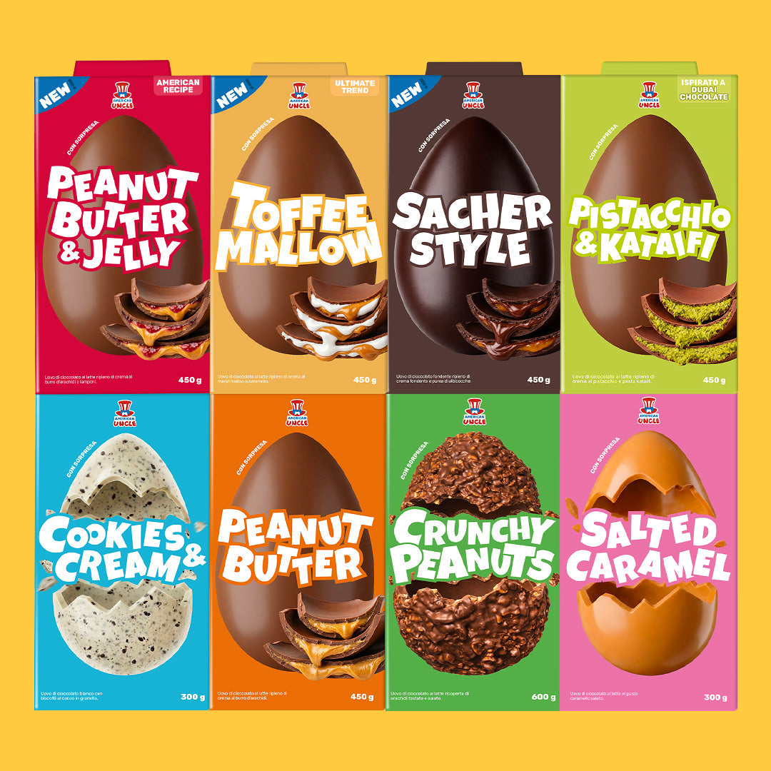 Ramène à la maisonle jackpot de Pâques complet: tous les 8 œufs les plus exclusifs jamais créés- réalisés à la main avec du chocolat belge fin - chacun avec une âme différente et un goût qui fait exploser les papilles. Peanut Butter, Crunchy Peanut, Cookies & Cream, Salted Caramel, Pistacchio & Kataifi, Peanut Butter & Jelly, Sacher Style, Toffee Mallow - en choisir un seul serait un crime !